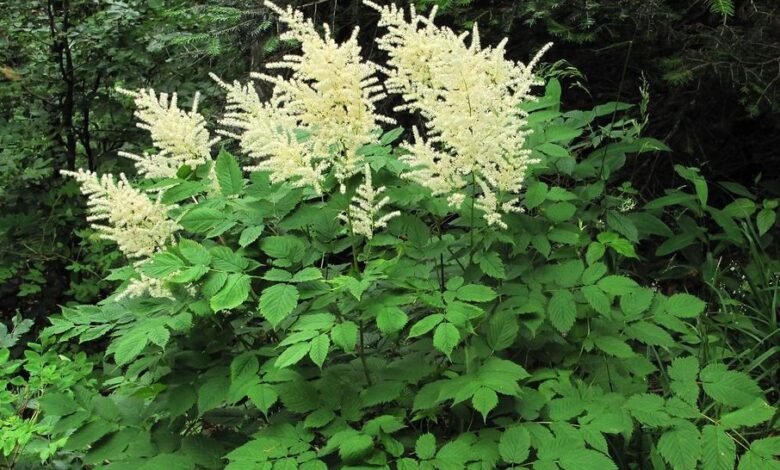 La barba di capra (Aruncus dioicus)  è una pianta erbacea, perenne appartenente alla famiglia delle Rosacee. La pianta può raggiungere i 2 metri. Le foglie sono molto lunghe (fino a 1 m), decisamente picciolate e di tipo composto. Ogni foglia principale infatti è composta da gruppi di foglie pennatosette i cui segmenti finali (foglioline) sono lanceolati e lungamente acuminati (dimensione massima 5-8 cm). Questo tipo di foglia è chiamata anche tripennatosetta in quanto i lobi sono suddivisi tre volte.