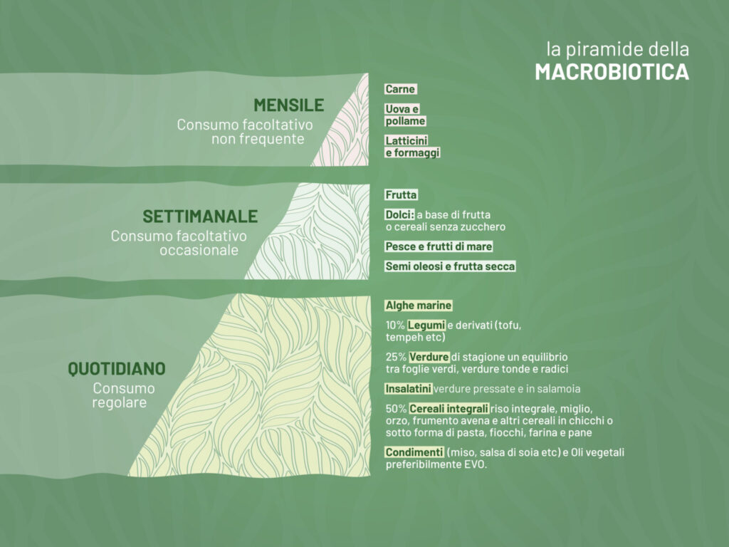 Ecco la piramide che è alla base dell’alimentazione macrobiotica. Essa è organizzata in modo che: