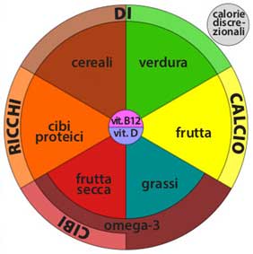 Al centro del piatto, due semicerchi che rappresentano rispettivamente la vitamina B12 e la vitamina D, a significare una particolare attenzione verso queste due vitamine.